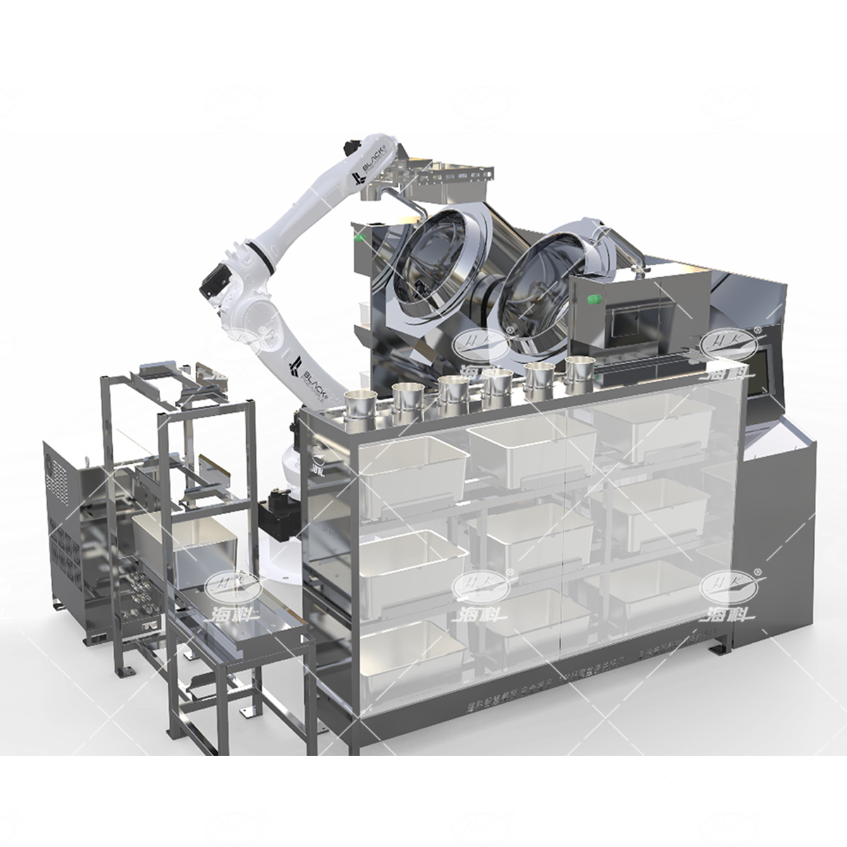可用于集體用餐的食堂(機關(guān)、院校、工廠、中央廚房配餐中心等大型食堂)等場景量身打造的烹飪系統(tǒng),主要由空盆/成品智能庫、凈菜/調(diào)理肉/調(diào)料智能庫、工控上位機SaaS軟件系統(tǒng)、數(shù)字化智能炒菜鍋以及工業(yè)級機器人組成,工控上位機對接云端,接收并統(tǒng)一向各模塊發(fā)出指令。